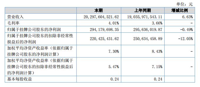 報(bào)告期內(nèi),公司實(shí)現(xiàn)營業(yè)收入202.97億元,同比增長6.63%;凈利潤2.94億元,同比下降0.38%。?
