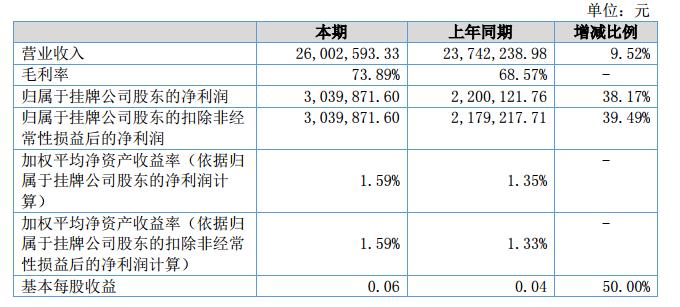 報(bào)告期內(nèi)公司實(shí)現(xiàn)營(yíng)業(yè)收入2,600.26萬(wàn)元,較上年同期2,374.22萬(wàn)元增長(zhǎng)9.52%。營(yíng)業(yè)成本為678.83萬(wàn)元,較上年同期746.19萬(wàn)元下降9.03%;凈利潤(rùn)為273.99萬(wàn)元,較去年同期220.11增長(zhǎng)24.48%。截至2018年6月30日,公司總資產(chǎn)為21,033.10萬(wàn)元,較本期期初20,791.80增長(zhǎng)1.16%;資產(chǎn)負(fù)債率為5.98%,較本期期初下降了0.23個(gè)百分點(diǎn)。?