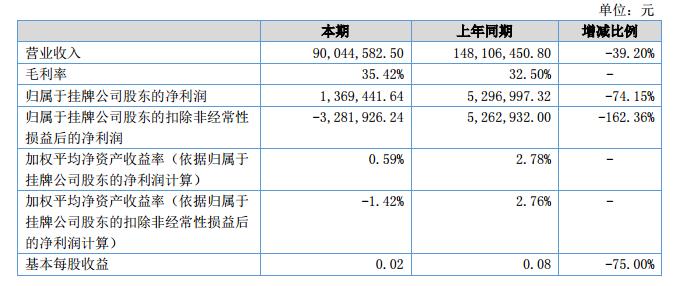 報(bào)告期內(nèi),公司實(shí)現(xiàn)營(yíng)業(yè)收入90,044,582.50元,相比上年同期下降39.20%;營(yíng)業(yè)成本為96011929.89元,相比上年同期下降34%;實(shí)現(xiàn)凈利潤(rùn)1,369,441.64元,相比上年下降74.15%。凈利潤(rùn)相較去年同期下降由于公司整體仍處于業(yè)務(wù)轉(zhuǎn)型期所導(dǎo)致。