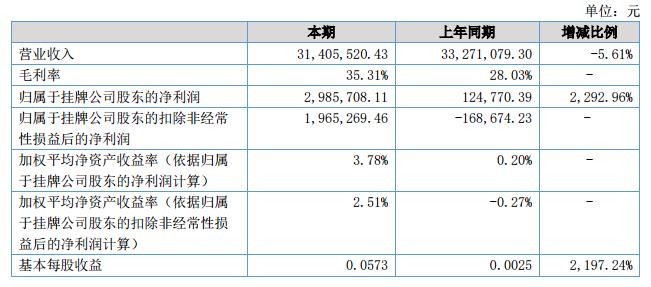 報告期內(nèi),公司實現(xiàn)營業(yè)收入31,405,520.43元,同比降低了5.61%;營業(yè)成本為20,315,463.76元,同比降低了15.16%;實現(xiàn)凈利潤2,985,708.11元,同比提高了2,292.96%。?