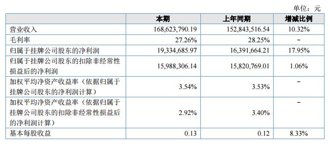 報(bào)告期內(nèi),公司實(shí)現(xiàn)營業(yè)收入168,623,790.19元,比上年同期152,843,516.54元,增加了15,780,273.65元,增幅為10.32%;公司實(shí)現(xiàn)凈利潤為18,676,266.71元,比上年同期14,716,960.72元增加了3,959,305.99元,增加了26.90%。