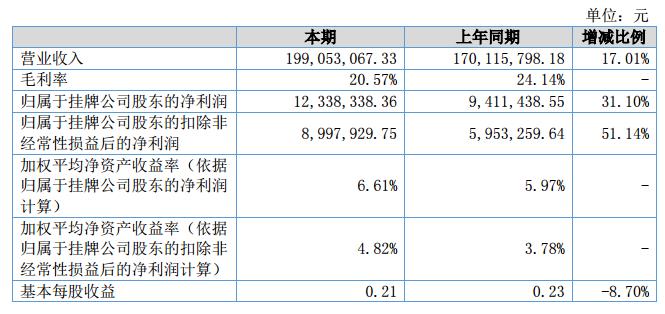 報告期內(nèi),營業(yè)收入199,053,067.33元,較去年同期增長17.01%;歸屬于掛牌公司股東的凈利潤12,338,338.36元,同比增長31.10%。?