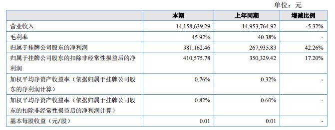 報(bào)告期內(nèi),公司實(shí)現(xiàn)營(yíng)業(yè)收入1,415.86萬(wàn)元,比上年同期下降了5.32%;本期毛利率45.92%與上年同期40.38%上升了5.54%;本期凈利潤(rùn)-52.99萬(wàn)元,比上年同期下降了297.80%。