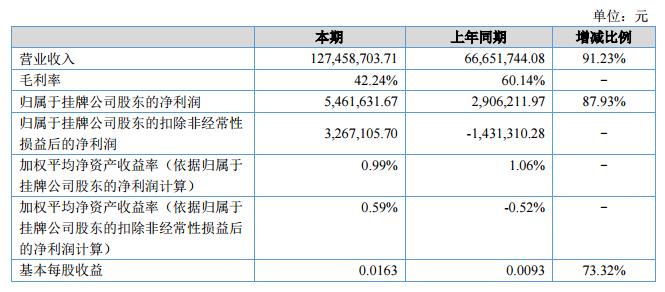 報告期內(nèi),公司營業(yè)收入為12,745.87萬元,較上年同期增長91.23%;本期毛利率為42.24%,較上年同期有一定幅度下降,主要原因是本期系統(tǒng)集成收入占比上升。本期凈利潤為546.16萬元,較上年同期增長87.93%,主要原因是公司業(yè)務收入的增加。?