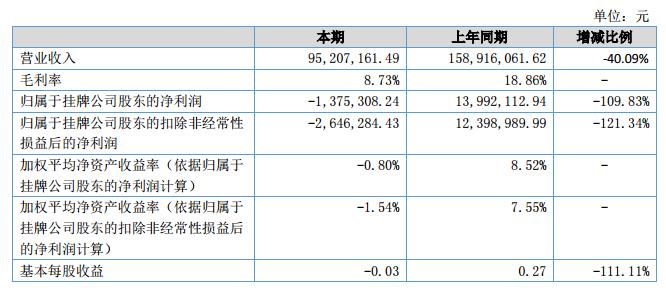 公司實現(xiàn)主營業(yè)務(wù)收入為9,196.69萬元,較上年同期減少了6,216.34萬元,降幅為40.33%,主營業(yè)務(wù)成本為8,371.73萬元,較上年同期減少了4,099.98萬元,降幅為32.87%,導(dǎo)致主營業(yè)務(wù)毛利從上年同期的19.08%下降至本年的8.97%;公司主營業(yè)務(wù)利潤為-195.20萬元,較上年同期減少了1,735.45萬元,下跌112.67%,2018年度1-6月公司凈利潤為-137.53萬元,較上年同期減少了1,536.74萬元,減幅為109.83%。?