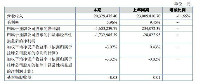 截至報(bào)告期末,公司總資產(chǎn)68,342,289.95,較年初增加1.41%、凈資產(chǎn)51,374,475.89較年初減少3.03%。報(bào)告期內(nèi),營(yíng)業(yè)總收入20,329,475.40元,較上年同期減少11.65%,營(yíng)業(yè)總成本19,117,722.44元,較上年同期下降8.24%,凈利潤(rùn)-1,603,239.79元,較上年同期減少702.21%。?