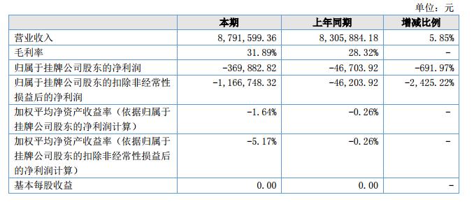 報告期內(nèi),公司實現(xiàn)營業(yè)收入879.16萬元,比去年同期增長了5.85%;公司營業(yè)成本985.66萬元,比去年同期增加18.01%;公司毛利280.39萬元,毛利率31.89%,比去年同期增長了3.57%;利潤總額-26.81萬元,比去年同期-4.71萬元減少了3.05%;凈利潤-36.99萬元?。