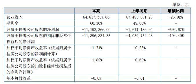 報(bào)告期內(nèi),公司實(shí)現(xiàn)營業(yè)收入64,817,357.06元,上年同期實(shí)現(xiàn)營業(yè)收入87,495,081.23元,同比下降25.92%;毛利率由上年同期49.66%上升至本期60.36%;歸屬于掛牌公司股東的凈利潤-11,192,366.00元,上年同期歸屬于掛牌公司股東的凈利潤為-1,611,186.94元,同比虧損增加594.67%。?