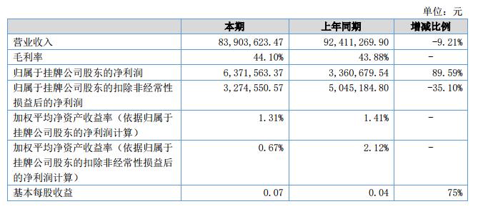 報(bào)告期內(nèi),公司實(shí)現(xiàn)83,903,623.47元的收入規(guī)模,公司管理層按照董事會(huì)制定的戰(zhàn)略規(guī)劃和經(jīng)營(yíng)計(jì)劃,公司堅(jiān)持以市場(chǎng)為導(dǎo)向,通過提升服務(wù)質(zhì)量,促進(jìn)主營(yíng)業(yè)務(wù)的穩(wěn)健發(fā)展。2018年1-6月,公司實(shí)現(xiàn)營(yíng)業(yè)收入83,903,623.47元,與去年同期92,411,269.91元相比,略有下降。公司實(shí)現(xiàn)歸屬于掛牌公司股東的凈利潤(rùn)6,371,563.37元,較去年同期3,360,679.54元,有一定幅度提升。?