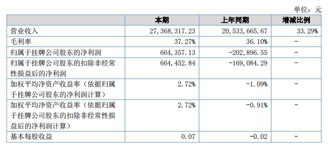 報告期內(nèi),公司實現(xiàn)營業(yè)收入2,736.83萬元,較2017年同期上升683.47萬元,同比上升33.29%,主要原因系公司所處激光類產(chǎn)品行業(yè)景氣度提升,公司產(chǎn)品需求增加,公司產(chǎn)品的生產(chǎn)和發(fā)貨量增長,導(dǎo)致收入增加所致歸屬于母公司股東的凈利潤66.44萬元,較2017年同期上升86.73萬元。?