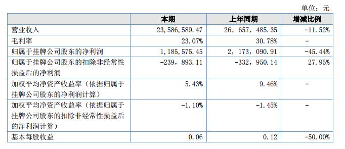 2018年1-6月,公司營業(yè)收入為2358.66萬元,同比減少11.52%;公司營業(yè)成本1,814.56萬元,同比減少1.66%;凈利潤為118.56萬元,同比減少45.44%;本期期末每股收益為0.06元。公司上半年整體發(fā)展趨勢較好,雖然銷售較上年同期有一定比例的減少,但公司仍有較多的盈利,主要原因是上半年政府補(bǔ)助有可觀的收入。?