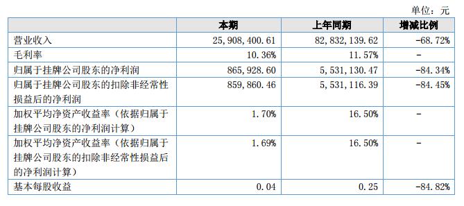 2018年上半年實(shí)現(xiàn)營業(yè)收入2,590.84萬,較去年同期減少68.72%,實(shí)現(xiàn)凈利潤86.59萬元,較去年同期減少84.34%。?