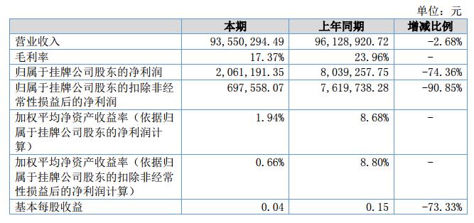 報告期內(nèi)公司營業(yè)收入為93,550,294.49元,比上年同期下降2.68%,凈利潤2,065,934.95元,比上年同期下降74.35%。?
