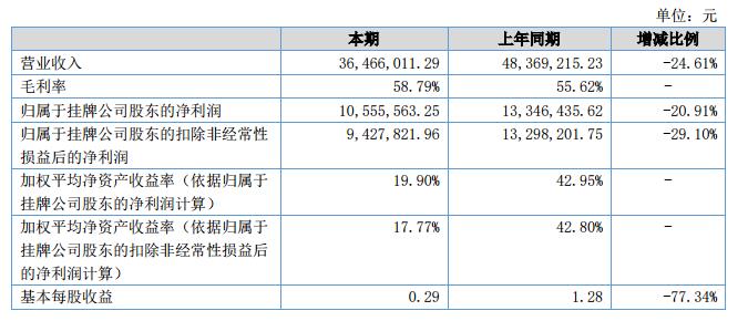 報(bào)告期內(nèi),公司營(yíng)業(yè)收入3,646.60萬元,比上年同期相比下降24.61%,實(shí)現(xiàn)歸屬于掛牌公司股東的凈利潤(rùn)1,055.55萬元,經(jīng)營(yíng)活動(dòng)產(chǎn)生的現(xiàn)金流量?jī)纛~1,302.58萬元。?