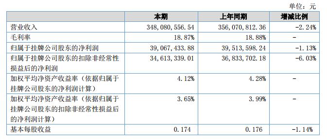 報(bào)告期內(nèi)公司實(shí)現(xiàn)營業(yè)收入34,808.06萬元,同比下降2.24%;營業(yè)成本28,239.61萬元,同比下降2.24%。實(shí)現(xiàn)歸屬于掛牌公司股東的凈利潤3,906.74萬元,同比下降1.13%;基本每股收益0.174,同比下降1.14%。