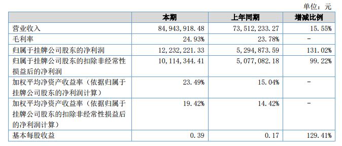 報(bào)告期內(nèi)公司實(shí)現(xiàn)營(yíng)業(yè)收入84,943,918.48元,較上年同期增長(zhǎng)了15.55%;營(yíng)業(yè)成本63,765,742.24元,較上年同期增加了13.8%;實(shí)現(xiàn)凈利潤(rùn)12,232,221.33元,較上年同期增長(zhǎng)了131.02%;成本的增長(zhǎng)率低于營(yíng)業(yè)收入的增長(zhǎng)率,公司的盈利能力不斷增強(qiáng)。報(bào)告期內(nèi),公司總資產(chǎn)84,241,638.37元,同比增長(zhǎng)10.43%,凈資產(chǎn)58,247,931.26元,同比增長(zhǎng)了26.58%。?