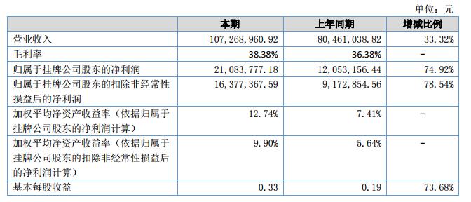 報(bào)告期內(nèi)公司財(cái)務(wù)狀況良好,營(yíng)業(yè)收入大幅增加,盈利能力明顯增強(qiáng),現(xiàn)金流充足,資產(chǎn)負(fù)債率低。報(bào)告期內(nèi),公司實(shí)現(xiàn)營(yíng)業(yè)收入10,726.90萬(wàn)元,較上年同期增加2,680.80萬(wàn)元,同比增長(zhǎng)33.32%;實(shí)現(xiàn)凈利潤(rùn)2,102.70萬(wàn)元,較上年同期增加899.90萬(wàn)元,同比增長(zhǎng)74.82%。?