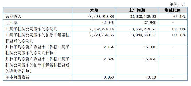 報告期內,公司實現(xiàn)營業(yè)收入38,399,919.86元,同比增長67.46%。主要原因為:受益公司對銷售市場的重新布局,積極發(fā)展新的銷售渠道,完善已有銷售模式。報告期內,公司產品毛利率42.94%,與去年同期產品毛利率37.68%有較大增長。主要原因為:公司對采購市場的價格上漲的預判,及時鎖定了部分材料價格,避免了材料成本上升帶來成本增加,同時公司加強了對生產車間的管理,使生產效率有了大幅提高。報告期內,公司的凈利潤1,634,033.82元,同比增長138.28%。主要原因為:報告期銷售收入的增長帶來的毛利貢獻增加,同時成本費用控制到位未出現(xiàn)大幅度變化。?