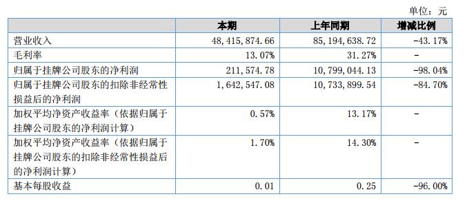 2018年上半年實現(xiàn)營業(yè)收入4,841.59萬元,同比減少43.17%。公司2018年上半年營業(yè)成本為4,208.86萬元,同比減少28.11%。公司2018年上半年綜合毛利率為13.07%,較上年同期減少了18.21個百分點。公司實現(xiàn)凈利潤21.16萬元,較上年同期減少1,058.75萬元。?