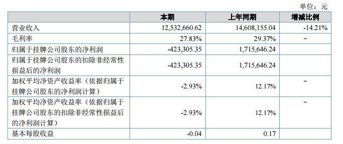 本期實現(xiàn)營業(yè)收入12,532,660.62元,較上年同期減少2,075,494.42元,減少了14.21%,公司營業(yè)成本9,044,729.65元,較上年同期減少1,273,038.44元,減少了12.34%。本期歸屬于掛牌公司股東的凈利潤為-423,305.35元,上年同期1,715,646.24元。