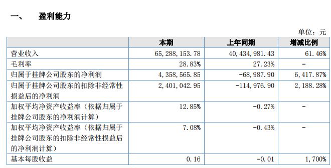 報(bào)告期內(nèi),公司資產(chǎn)總額 222,079,050.32 元,較年初增加 3,448,903.07 元,增幅 1.58%;本期負(fù)債總額為 185,967,897.89 元,較年初減少 909,622.78 元,減幅 0.49%;本期凈資產(chǎn)總額 36,111,152.43 元,較年初增加 4,358,565.85 元,增幅 13.73%;本期營(yíng)業(yè)收入 65,288,153.78 元,較上年同期增加 24,853,172.35 元,增幅 61.46%;本期營(yíng)業(yè)成本 46,467,082.87 元,較上年同期增加 17,041,153.98 元,增幅 57.91%,本期凈利潤(rùn) 4,358,565.85 元,較上年同期增加 4,427,553.75 元,增幅 6,417.87%,本期經(jīng)營(yíng)活動(dòng)產(chǎn)生的現(xiàn)金流量?jī)纛~ 21,269,168.07 元,較上年同期增加 12,733,523.51 元,增幅 149.18%。