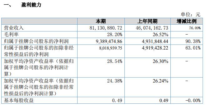 報告期內(nèi),公司實現(xiàn)營業(yè)收入 81,130,880.72 元,同比增長 76.09%;營業(yè)成本 58,248,561.44 元,同比增長 72.04%;營業(yè)毛利率為 28.20%,同比上升了 1.69%;利潤總額 1,134.94 萬元,同比增長 94.93%。項目重大變動原因: