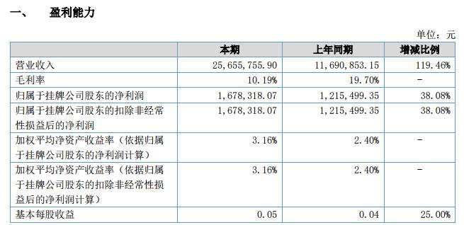 2018 年上半年,公司實現(xiàn)營業(yè)收入 25,655,755.90 元,較上年同期增加 13,964,902.75 元,增加比例為 119.46%;凈利潤為 1,678,318.07 元,較上年同期增加 462,818.72 元,增加比例為 38.08%;截至 2018 年 6 月 30 日,公司總資產為 56,335,480.18 元,較期初余額減少 3,931,383.63 元,減少比例為 6.53%;負債合計為 2,461,506.31 元,較期初余額減少 5,609,701.70 元,減少比例為 69.51%;凈資產為 17,156,676.48 元,較期初余額增加 1,510,486.26 元,增加比例為 9.66%。本報告期內經(jīng)營活動產生的現(xiàn)金流量凈額為-1,354,821.31 元,上期為-3,551,354.87 元,增長幅度為 61.85%。