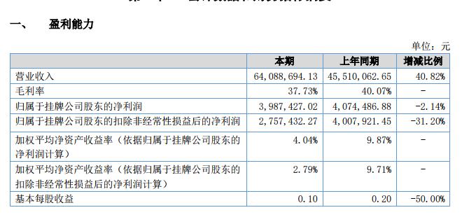 2018 年上半年公司簽訂的合同保持穩(wěn)定,實(shí)現(xiàn)營(yíng)業(yè)收入 6,408.87 萬(wàn)元,營(yíng)業(yè)成本 3,990.74 萬(wàn)元,凈利潤(rùn) 398.74 萬(wàn)元;上年同期營(yíng)業(yè)收入 4,551.01 萬(wàn)元,營(yíng)業(yè)成本 2,727.48 萬(wàn)元,凈利潤(rùn) 407.45 萬(wàn)元;本期與上年同期相比分別增長(zhǎng) 40.82%、46.32%及-2.14%。營(yíng)業(yè)收入與去年同期增長(zhǎng)較大的主要原因是本報(bào)告期的生產(chǎn)經(jīng)營(yíng)規(guī)模較去年擴(kuò)大,完工驗(yàn)收項(xiàng)目比去年同期增多;營(yíng)業(yè)成本增加較多的主要原因是原材料成本及直接人工成本上升;凈利潤(rùn)下降的主要原因是制造成本增長(zhǎng),員工增加及工資水平上升導(dǎo)致期間費(fèi)用增加較多,研發(fā)費(fèi)用比去年同期增長(zhǎng)較多。