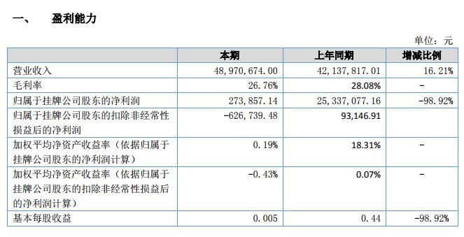 2018 年上半年,公司實現(xiàn)營業(yè)收入 48,970,674.00 元,同比增長 16.21%;利潤總額和凈利潤分別為 615,267.62 元、351,286.31 元,較去年同期分別下降 98.05 和 98.61%。截至 2018 年 6 月 30 日,公司總資產(chǎn)為 246,719,503.32 元,凈資產(chǎn)為 142,456,064.06 元。
