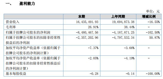 報(bào)告期內(nèi)公司實(shí)現(xiàn)營(yíng)業(yè)收入 1,643.55 萬元,較上年同期減少 325.94 萬元,減幅 16.55%;歸屬于掛牌公司股東的凈利潤(rùn) -848.05 萬元,較上年同期減少 429.26 萬元,減幅 102.50%。