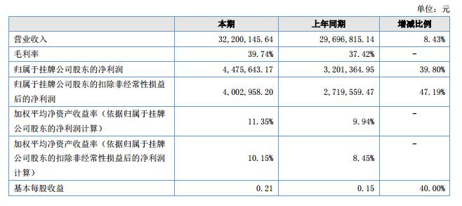 報(bào)告期內(nèi),公司實(shí)現(xiàn)營(yíng)業(yè)收入3,220.01萬(wàn)元,較上年同期增加250.33萬(wàn)元,同比增長(zhǎng)8.43%。報(bào)告期內(nèi),公司實(shí)現(xiàn)凈利潤(rùn)為447.56萬(wàn)元,較上年同期增加127.43萬(wàn)元,同比增長(zhǎng)39.80%。主要原因是:公司新近推出的系列產(chǎn)品獲得較好的利潤(rùn),使得企業(yè)的凈利潤(rùn)提高。?