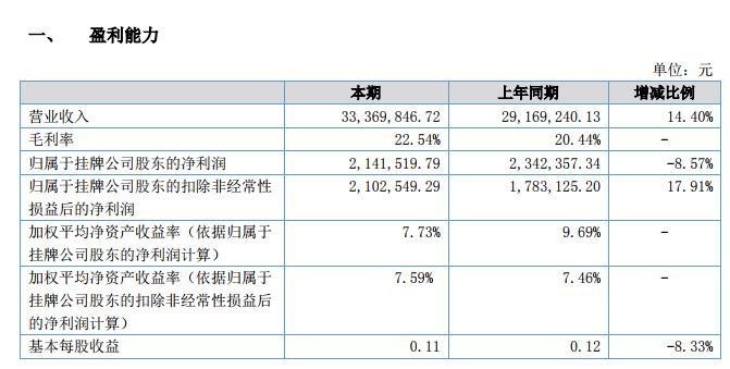 在報告期內,公司 2018 年 1-6 月實現(xiàn)營業(yè)收入 33,369,846.72 元,比上年同期增長 14.40%;2018 年 1-6 月實現(xiàn)利潤總額 2,952,952.48 元,比上年同期增長 8.58%;公司總資產為 48,425,646.30 元,凈資產為 28,772,966.52 元,較上期期末相比均有小幅增長,以上數(shù)據(jù)表明,公司財務狀況及盈利水平較上期水平平均均有較大提升。