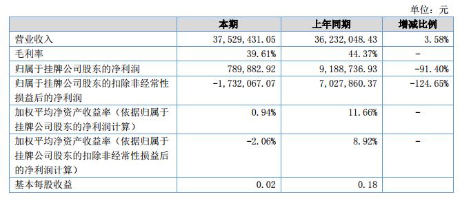 2018年上半年,公司營業(yè)收入37,529,431.05元,較上年同期增加1,297,382.62元,增幅3.58%;公司的營業(yè)成本22,663,591.41元,較上年同期增加2,508,721.75元,增幅12.45%;凈利潤789,882.92元,較上年同期減少8,398,854.01元,降幅91.40%。?