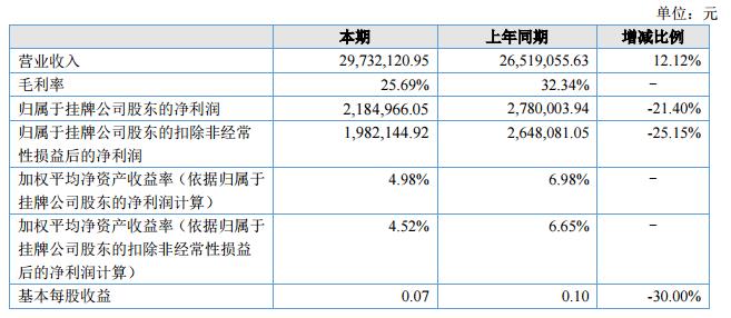 報告期內(nèi),公司實現(xiàn)營業(yè)收入29,732,120.95元,比去年同期增加3,213,065.32元,同比增長12.12%,歸屬于掛牌公司股東的凈利潤2,184,966.05元,比去年同期減少595,037.89元,同比減少21.40%。公司報告期末總資產(chǎn)75,652,408.61元,比年初下降3.73%;凈資產(chǎn)43,292,856.29元,比年初下降1.74%;負債總額32,359,552.32元,同比下降6.27%。公司經(jīng)營活動現(xiàn)金凈流量4,350,443.69元,上年同期為-3,134,572.73元,比同期增加7,485,016.42元,公司正常的經(jīng)營活動產(chǎn)生現(xiàn)金凈流量有了較大的改善。?