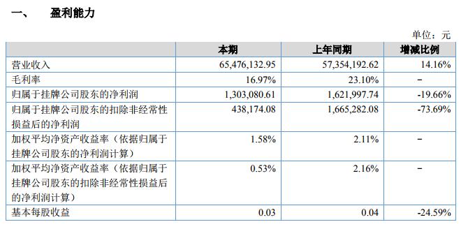 凈利潤分析:本期實(shí)現(xiàn)凈利潤為 130.31 萬元,上年同期為 162.20 萬元,減少 31.89 萬元,同比下降 19.66%,凈利潤下降的原因營業(yè)利潤下降所致。營業(yè)利潤下降的主要原因是本期產(chǎn)品的毛利率下降,本期毛利率為 16.97%,比上年同期的 23.10%,下降 6.13%。本期客戶要求產(chǎn)品降價(jià),產(chǎn)品平均降價(jià)約 3%,同時(shí)原材料價(jià)格與上年同期對比上漲約 5%,產(chǎn)品降價(jià)和原材料漲價(jià)是毛利率降低的主要原因。