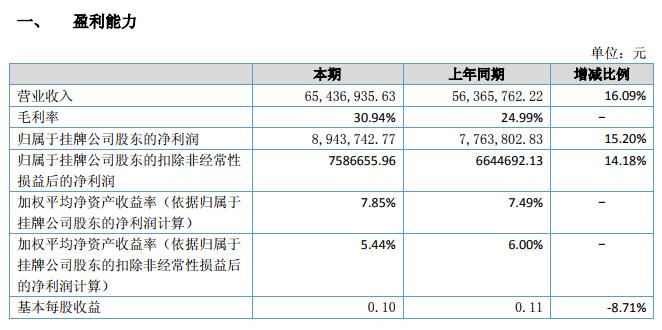 公司報(bào)告期內(nèi),實(shí)現(xiàn)營(yíng)業(yè)收入 6,543.69 萬(wàn)元,較上年同期 5,636.58 萬(wàn)元增加 907.11 萬(wàn)元,增幅 16.09%;歸屬于掛牌公司股東的凈利潤(rùn) 894.37 萬(wàn)元,較上年同期 776.38 萬(wàn)元增加 117.99 萬(wàn)元,增幅 15.20%。