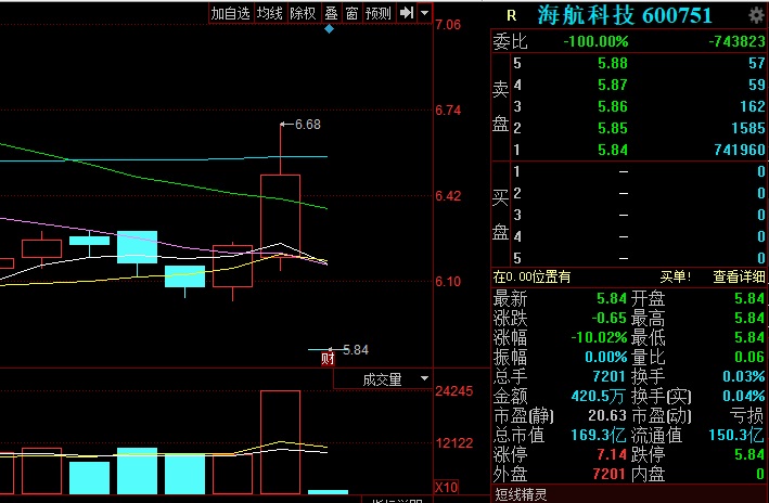 今天是長(zhǎng)達(dá)8個(gè)月停牌后航海科技的第一個(gè)交易日,開(kāi)盤(pán)即遭遇跌停,直至收盤(pán)。全天共成交7201手,成交額為420.5萬(wàn),換手率僅0.03%。截至收盤(pán),海航科技報(bào)收于5.84元,跌幅為10.02%,封單超74萬(wàn)手。