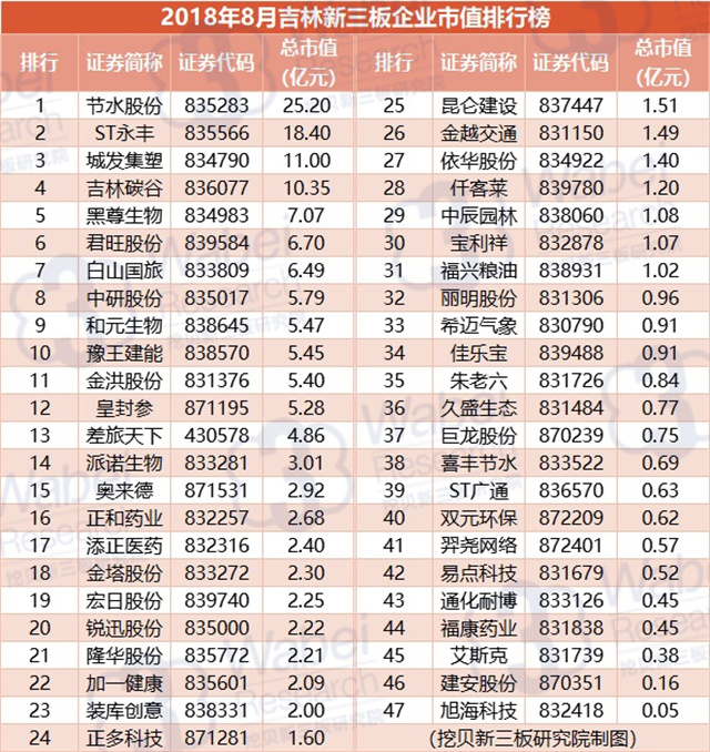 附:2018年8月吉林新三板企業(yè)市值排行榜