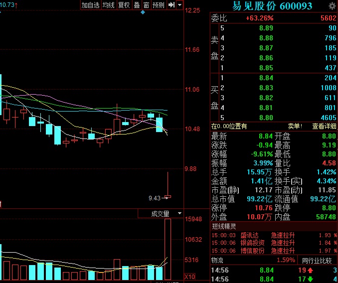 9月28日,易見股份跳空下跌,最終報(bào)收于8.84元/股,跌9.61%。成交量15.95萬(wàn)手,是昨成交量的近五倍。