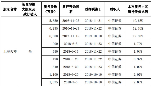 這已經(jīng)是上海天神對持有天順風(fēng)能股份的第13次質(zhì)押。截至目前,上海天神持有天順風(fēng)能股份5.30億股,占公司總股本的29.81%,是公司的控股股東。2016年11月以來,上海天神共對持有天順風(fēng)能的股份進(jìn)行了13次質(zhì)押,共質(zhì)押了3.65億股,累計質(zhì)押股份占其所持股份的比例高達(dá)68.85%,占天順風(fēng)能總股本的20.52%。13次質(zhì)押的到期日均在今年11月以后。