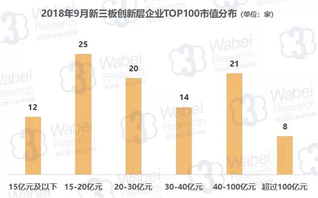 截止到2018年9月30日,新三板共有10946家掛牌公司,其中,創(chuàng)新層有933家企業(yè),占比8.5%。挖貝新三板研究院梳理出2018年9月全國新三板創(chuàng)新層企業(yè)市值TOP100(以下簡稱:TOP100)。