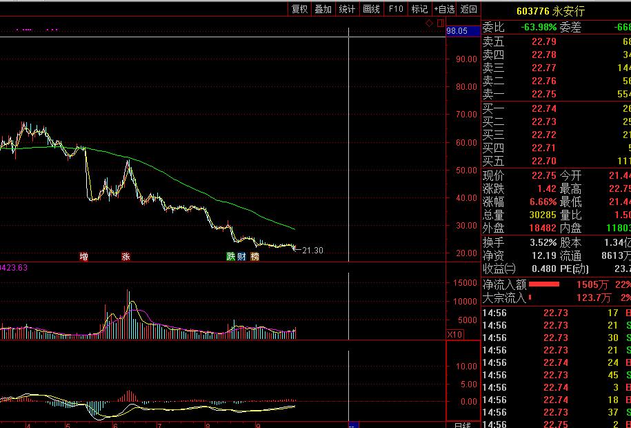 炒股軟件顯示,近半年來,永安行股價(jià)已經(jīng)從42元/股附近跌至目前21元/股附近。6月份股價(jià)在50元/股附近,成交量放大。