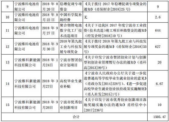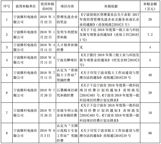 維科技術收到政府補助的明細顯示,公司獲得補貼的單位正是維科電池和維科新能源。其中,維科電池獲得補助12項,獲得補貼金額共1468.8萬元,維科新能源獲得補助3項,獲得補貼金額共36.67萬元。