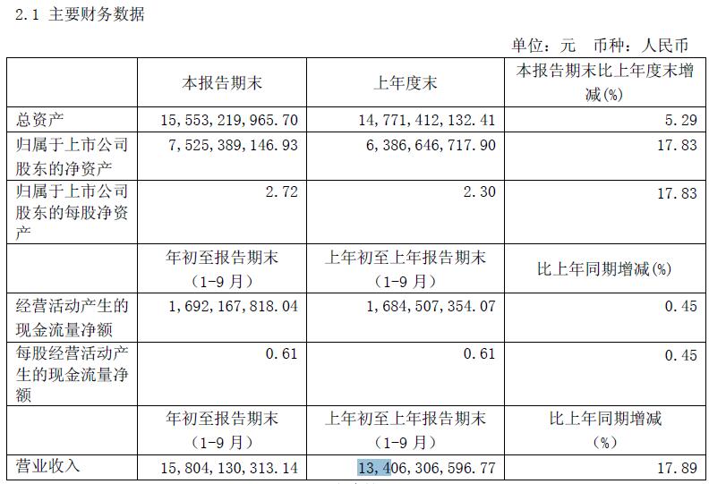 前三季度收入158億元,去年同期為134億元,同比增長(zhǎng)17.89%;利潤(rùn)為12.8億元,去年同期為9.96億元,同比增長(zhǎng)28.21%;總資產(chǎn)155.5億元,去年同期為147.7億元,同比增長(zhǎng)5.29%;歸屬于上市公司股東的凈資產(chǎn)75.25億元,同比增長(zhǎng)17.83%。