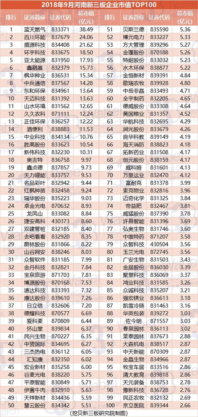 附:2018年9月河南新三板企業(yè)市值TOP100