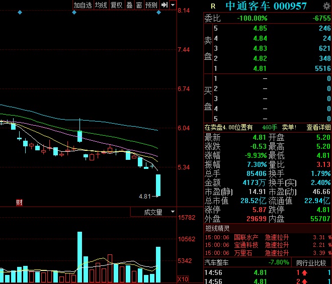 今日,大盤整體走勢不佳,深證成指下跌6.07%。中通客車今日股價跌停,報收于4.81元/股,跌停封單5516手,成家量明顯放大。近期,中通客車股價已跌至自2014年7月以來的新低。