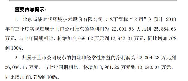 高能環(huán)境稱,經(jīng)公司財(cái)務(wù)部門初步測(cè)算,預(yù)計(jì) 2018 年前三季度利潤(rùn)在2.2億元-2.59億元之間,與上年同期相比,將增加 9,059.62 萬(wàn)元到1.29億元,同比增加 70%到 100%。