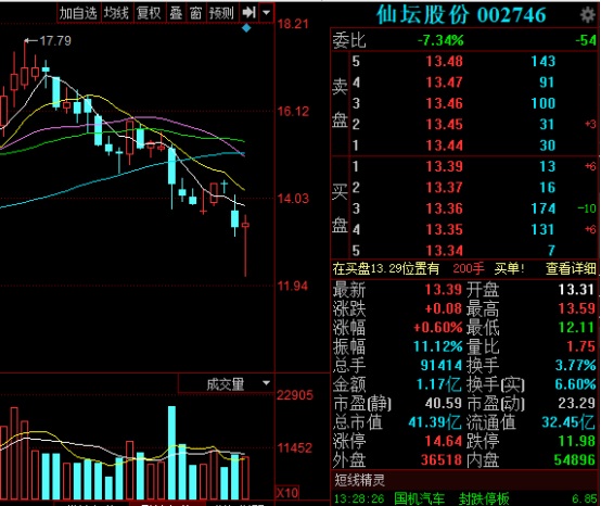 今日,仙壇股份盤中探底后再走高,截至發(fā)稿,仙壇股份股價(jià)為13.39元/股,漲0.6%。
