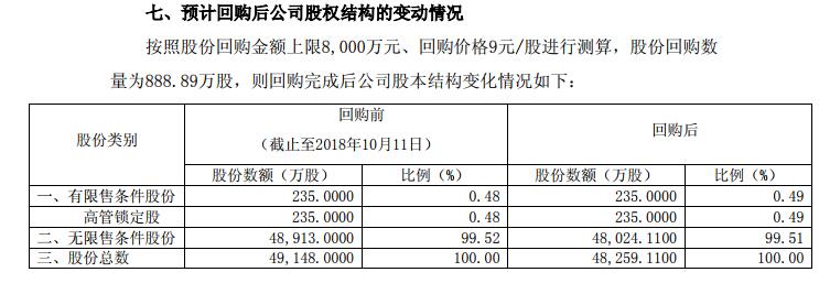 據(jù)介紹,本次回購金額不低于3000萬元且不超過8000萬元。按照不超過9元/股計算,回購的股票數(shù)量在333.33萬股和888.89萬股之間,占公司總股份0.6782%至1.8086%?;刭彿桨缸怨蓶|大會審議通過回購股份方案之日起6個月內(nèi)執(zhí)行完畢。