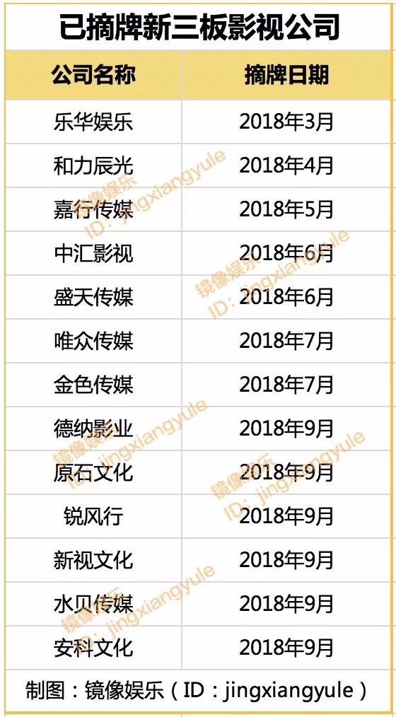 不僅A股異常寒冷,新三板的影視公司日子也不好過。繼上半年樂華文化、嘉行傳媒和中匯影視摘牌后,又有德納影業(yè)、原石文化、銳風行、唯眾傳媒、中匯影視、金色傳媒、盛天傳媒等多家新三板影視公司摘牌。